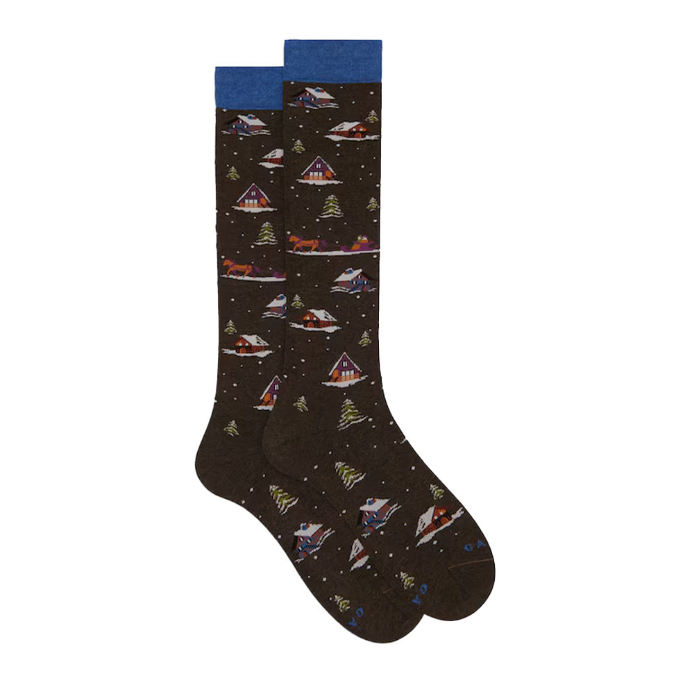 Le Gallo Lungo Fantasia Baite Innevate catturano l’atmosfera calda e accogliente delle festività invernali, trasformando un accessorio quotidiano in un dettaglio di stile unico. Queste calze lunghe da uomo, realizzate in morbido cotone, combinano comfort, qualità e una fantasia esclusiva che richiama paesaggi di montagna e chalet immersi nella neve.