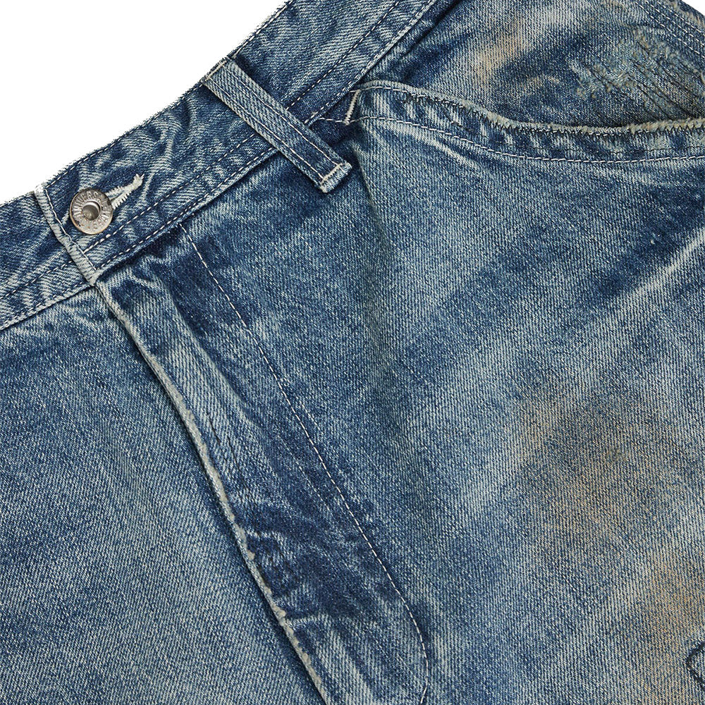 Realizzati in denim resistente, presentano una costruzione strutturata con vestibilità ampia e gamba dritta. I pannelli patch applicati e i dettagli grafici ricamati richiamano l’heritage industriale del brand, mentre le sfumature e i trattamenti sul tessuto donano profondità e carattere. La struttura a cinque tasche è arricchita da ulteriori inserti e rinforzi, enfatizzando l’ispirazione utility.