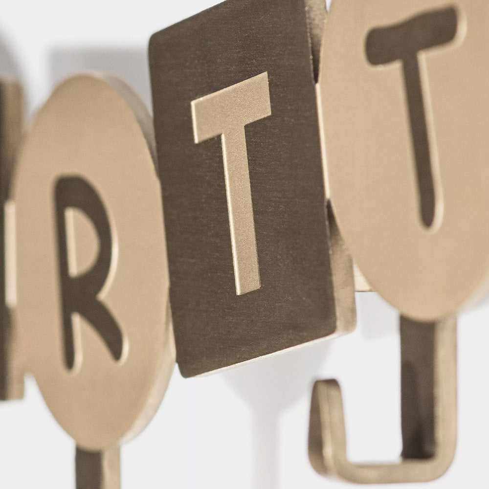 Ogni modulo presenta una lettera sagomata applicata su una piastra geometrica con gancio integrato, permettendo di comporre la scritta in modo dinamico a parete. La struttura solida garantisce resistenza e praticità nell’utilizzo quotidiano, ideale per ingresso, studio o ambiente retail.