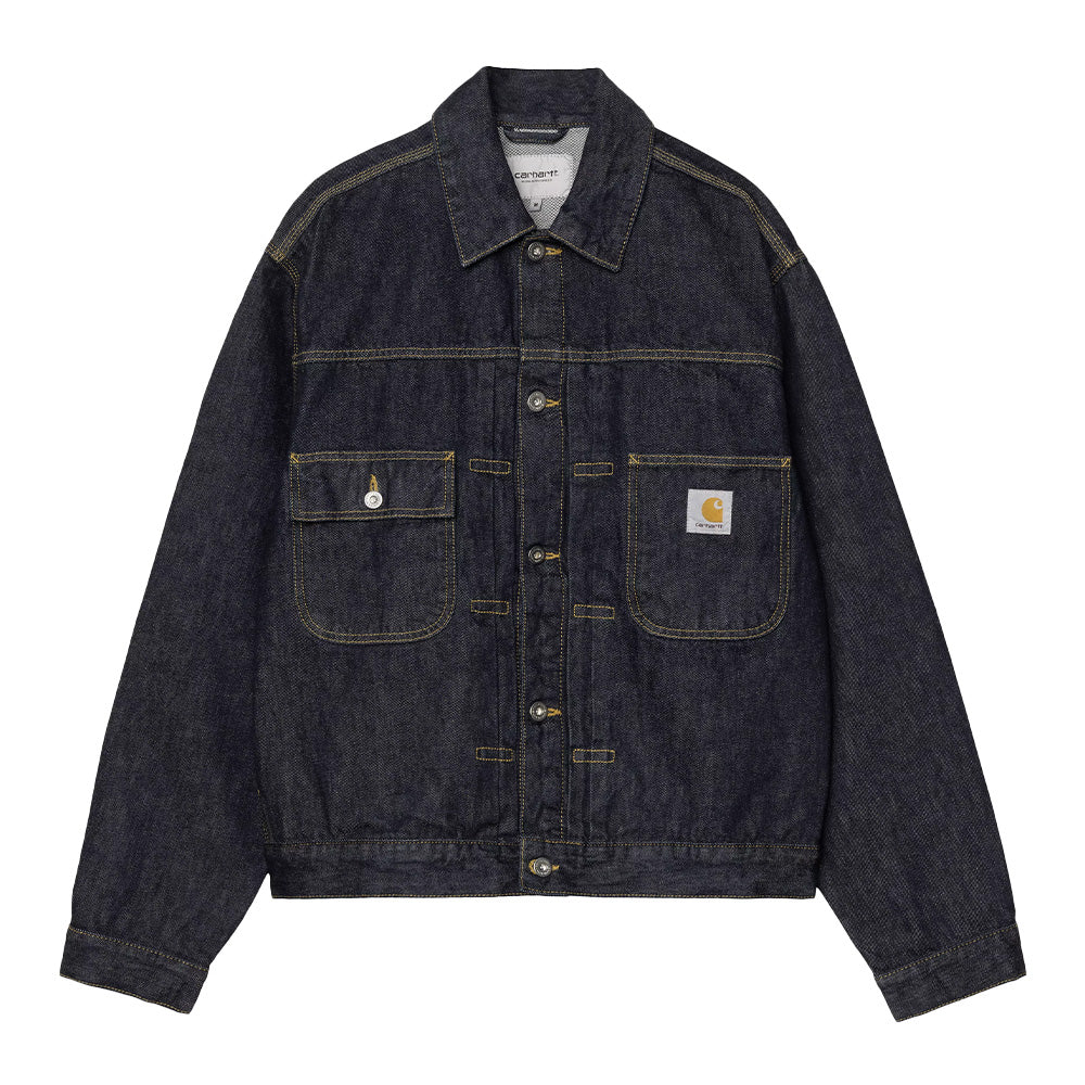 Il design presenta chiusura frontale con bottoni metallici, colletto classico e tasche applicate sul petto, una delle quali impreziosita dall’etichetta quadrata Carhartt WIP. Le cuciture a contrasto enfatizzano la costruzione e richiamano l’heritage del brand, mentre la vestibilità regolare garantisce libertà di movimento e versatilità negli abbinamenti.